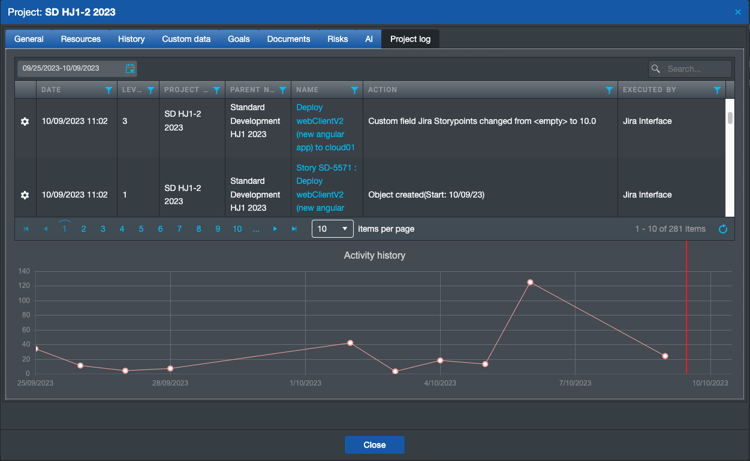 Here you can see that 281 changes were made between the project start and 10/09. The date/time range can of course be changed by the user. This can take a while if a lot of entries are loaded.