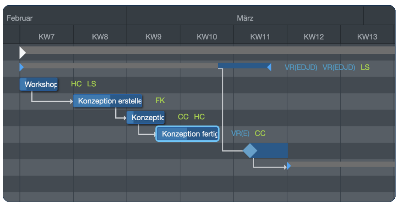 Alle Elemente wurden mit Ressourcen, Skills und/oder Teams beplant. Die grünen Initialen zeigen, wer hier arbeiten muss (das VR steht für “virtuelle Ressource”, damit ist eine Abteilung oder ein Skill gemeint)